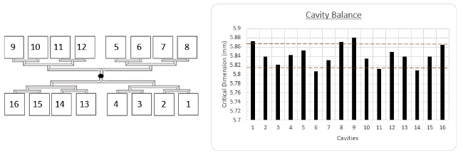 It is also a problem that is very difficult, if not impossible, to solve through process changes. The reason for this is that all the cavities change when altering a process, not just the one that is problematic. For example, using the data in Figure 4, if packing pressure or time is reduced to bring the cavities that are too high (1, 7, and 8) down to an acceptable level, then all the cavities will experience less packing. This would cause the dimensions of all the cavities to decrease, including the cavities with dimensions that are already too small (6, 11, and 14). For this reason, balance problems generally cannot be fixed with process changes, an approach that the industry often attempts.