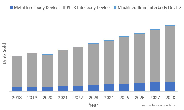 Traditional interbody devices replace the intervertebral disc of the spine while maintaining vertebral height and varying degrees of mobility within the patent. Devices are segmented by surgical access and interbody device material type. There are three major types of implants used: metal-based interbody implants, polyetheretherketone (PEEK) devices, and machined bone interbody devices.