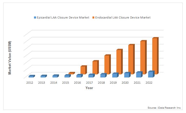 Though the FDA’s approval of the WATCHMAN in March 2015 has created a surge in market enthusiasm for endocardial devices, epicardial devices will continue to play an important role in the treatment of AF patients who are unable to take anticoagulants. The increasing share of endocardial devices reflects the explosive growth of the endocardial segment, rather than negative growth in the epicardial segment. In fact, awareness of the need for LAA management generated by the growing endocardial segment is expected to have positive spillover effects on the epicardial segment, driving steady growth in the value of the epicardial segment in the mid-teens through 2022.3