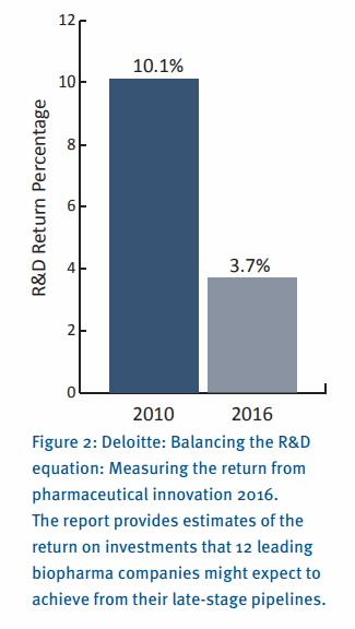 As the Deloitte report highlights (see Figure 2), R&D costs per asset have stabilized, but the forecast peak sales per asset continue to decline - far fewer assets are considered to have blockbuster status (peak sales greater than 1 billion USD). Pricing is one of the biggest challenges, however addressing unmet clinical needs is also difficult as more drugs are targeting second or third line treatment options.