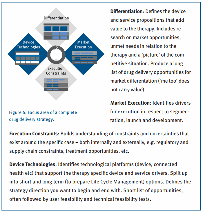 Medicom Innovation Partner (a Phillips-Medisize company) has developed and applied just such a strategic approach, helping biopharmaceutical companies evaluate opportunities across a therapy specific medicinal product. We utilize this approach to identify all the ways the delivery device can support patients and lead to improved outcomes. Figure 6 illustrates the four main aspects a complete and implementable strategy must include.