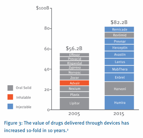 Underneath this backdrop of a challenging industry environment, a smaller revolution has been taking place. Recent drugs, particularly biologics, require new means of administration, moving beyond traditional oral delivery (i.e. tablets and capsules). In most cases, these drugs require more complex delivery devices, which provide the means to administer the drug into the patient. As the chart below indicates, this transformation has been revolutionary. Of the top 10 drugs by global sales revenue in 2015, 8 are liquid formulations requiring some form of injection. This is in stark contrast to the list of top 10 drugs in 2005, all of which were small molecules, with 9 delivered orally. In the space of 10 years, drug delivery devices have moved from niche applications to become a central technology that is core to the competitiveness of most biopharmaceutical companies.