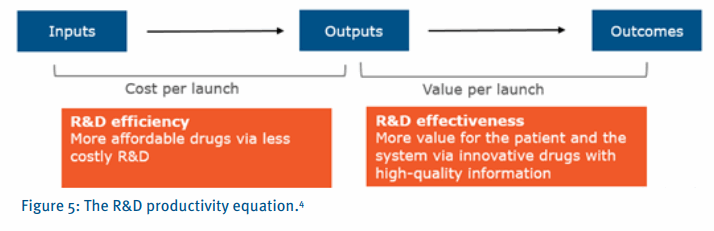 The answer to this question, as highlighted in an article in Nature (Figure 5), is to focus on ‘value per launch’ as opposed to traditional efficiency mechanisms. This article essentially highlights that most biopharmaceutical companies have traditionally focused their R&D productivity improvement efforts on efficiency, reducing the cost per launch, as opposed to effectiveness, increasing the value per launch. To improve R&D productivity, it is crucial to understand the interdependencies between inputs (e.g. R&D investments), output (e.g. new molecular entity launches) and outcomes (e.g. valued outcomes for patients). Figure 5 outlines the key dimensions of R&D productivity and the goals tied to R&D efficiency and effectiveness.